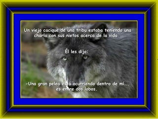 El viejo cacique le cuenta a sus nietos sobre la lucha interna entre dos lobos que representan las cualidades positivas y negativas en todos los seres humanos. El lobo de las cualidades negativas incluye la maldad y el temor, mientras que el lobo de las cualidades positivas incluye la bondad, la paz y el amor. El cacique les dice a sus nietos que el lobo que gane la lucha interna dependerá de cuál de los dos alimenten más.