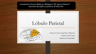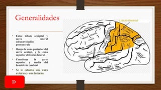 El lóbulo parietal, ubicado entre el lóbulo occipital y el surco central, comprende varias circunvoluciones y áreas de Brodmann relacionadas con la percepción sensorial y el procesamiento del lenguaje. Sus funciones principales incluyen la discriminación sensorial, la integración de información sensorial y la coordinación de áreas relacionadas con la memoria y el lenguaje. Lesiones en este lóbulo pueden afectar habilidades verbales y cambios de personalidad, dependiendo de si la lesión ocurre en el hemisferio izquierdo o derecho.