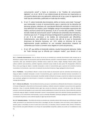 El resumen proporciona un análisis crítico del Informe Complementario de la Ley de Comunicación en Ecuador, identificando 6 graves amenazas a la libertad de expresión: 1) posibilidad de aplicación arbitraria de la ley debido a definiciones ambiguas de contenidos; 2) posibilidad de regular internet; 3) posibilidad de censura previa; 4) incremento de atribuciones del Consejo de Regulación convirtiéndolo en un híbrido de comisaría y ministerio; 5) transformación punitiva que puede conducir