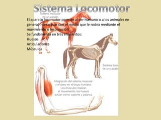 El documento describe el sistema locomotor humano, incluyendo los huesos, articulaciones y músculos. El sistema locomotor permite el movimiento mediante la interacción de estos tres elementos. Los huesos proporcionan estructura y protección, las articulaciones permiten el movimiento de los huesos, y los músculos, unidos a los huesos, generan fuerza y movimiento cuando se contraen.