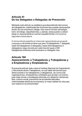 Este documento contiene resúmenes de varios artículos relacionados con la salud y seguridad laboral en Venezuela. El Artículo 41 establece que los trabajadores deben elegir delegados para que los representen ante el Comité de Seguridad y Salud Laboral, y especifica el número de delegados requeridos según la cantidad de trabajadores. El Artículo 104 habla sobre el asesoramiento que debe brindar el Instituto Nacional de Capacitación y Recreación de los Trabajadores a los empleados y empleadores. El Artículo 122 estable