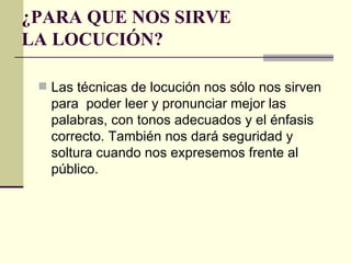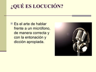 La locución es el arte de hablar frente a un micrófono de manera correcta y con la entonación y dicción apropiadas. Se divide en locución de lectura e improvisación y sirve para leer y pronunciar mejor las palabras con los tonos adecuados, dando seguridad al hablar frente a público. Incluye técnicas como la respiración diafragmática, flexibilidad bucal, resonancia, articulación, vocalización y entonación.
