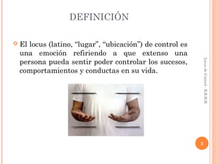 El documento define el locus de control como la medida en que una persona siente que puede controlar los eventos y comportamientos en su vida. Explica que un locus de control interno significa que la persona cree que puede controlar su propia vida a través de sus habilidades y decisiones, mientras que un locus de control externo significa que la persona cree que factores externos como la suerte o las acciones de otros controlan su vida y éxito.