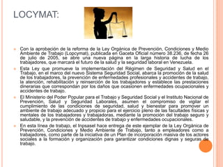 Este documento resume los principales derechos y deberes de los empleadores, trabajadores y la LOCYMAT (Ley Orgánica de Prevención, Condiciones y Medio Ambiente de Trabajo) en Venezuela. La LOCYMAT promueve la implementación del régimen de seguridad y salud en el trabajo para proteger a los trabajadores y establece las prestaciones por enfermedades y accidentes laborales. Los empleadores tienen el deber de garantizar condiciones de trabajo seguras y los trabajadores el derecho a un ambiente de trabajo saludable.