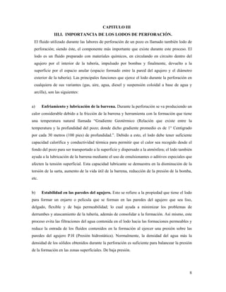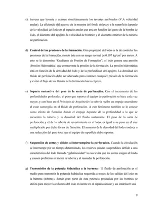El documento describe los diferentes tipos de lodos de perforación, incluyendo lodos a base de agua, inhibidos, de bajo contenido de sólidos y a base de aceite. Explica las funciones y propiedades de cada tipo de lodo, así como sus ventajas e inconvenientes para su uso en diferentes condiciones de perforación.