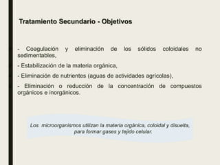 Este documento describe el proceso de lodos activados para el tratamiento biológico aeróbico de aguas residuales. El proceso utiliza microorganismos que consumen la materia orgánica en el agua residual formando flocs que pueden ser separados del efluente tratado a través de sedimentación. Se discuten los requisitos operacionales básicos como la aireación, la recirculación de lodos y la separación en el sedimentador secundario. También se describen varios tipos de procesos de lodos activados y su microbiología.