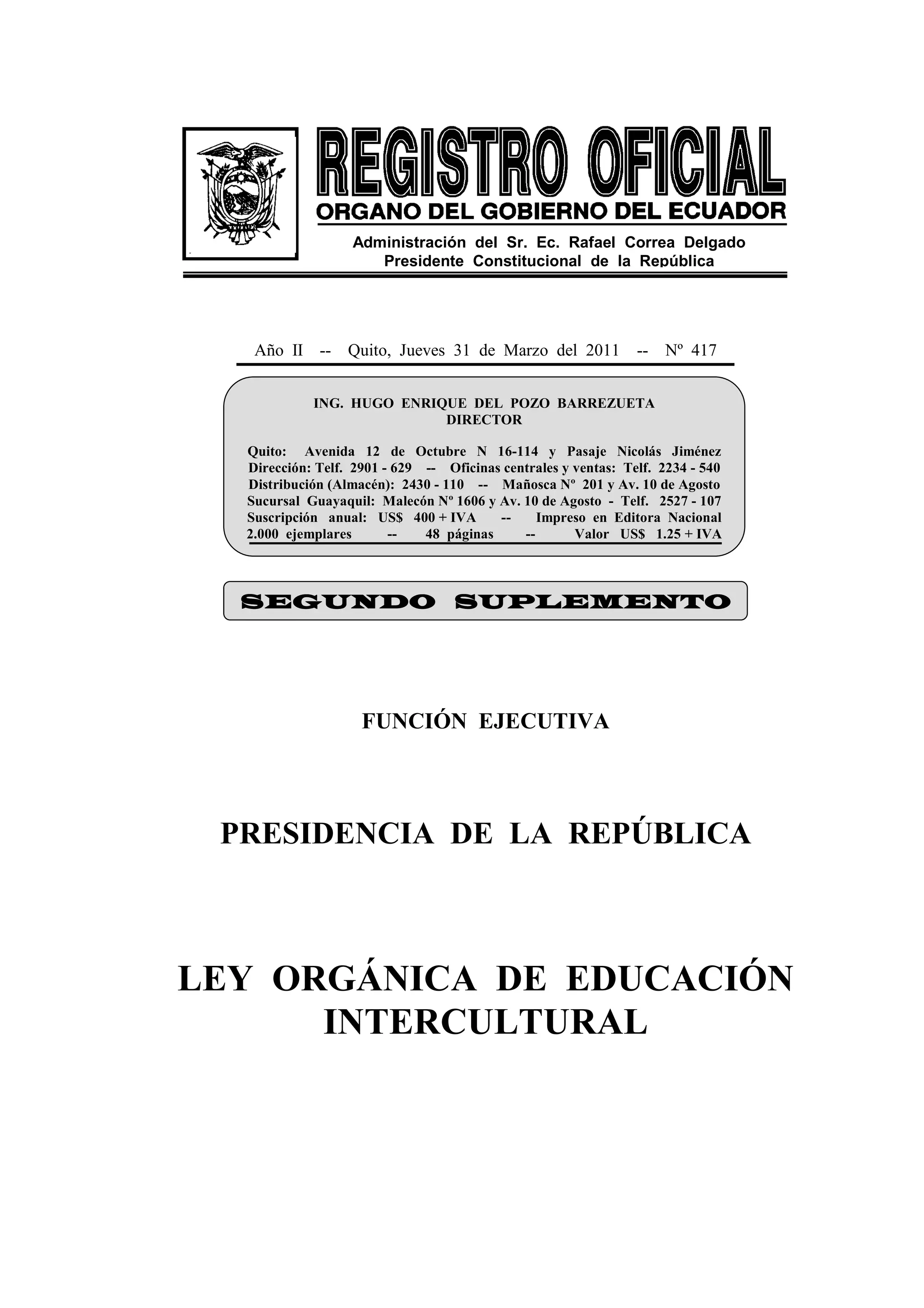 Este documento presenta el proyecto de Ley Orgánica de Educación Intercultural aprobado por la Asamblea Nacional y objetado parcialmente por el Presidente de la República. Se incluyen certificaciones sobre la recepción y tratamiento del proyecto de ley en la Asamblea Nacional y Presidencia. La Asamblea Nacional ratificó algunos artículos objetados pero no trató la totalidad de la objeción presidencial en el plazo establecido, por lo que el Presidente publicará la ley incorporando el resto de sus objeciones.