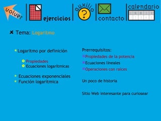 El documento presenta una introducción a los logaritmos, incluyendo su definición, propiedades y aplicaciones para resolver ecuaciones logarítmicas y exponenciales. Explica que un logaritmo representa el exponente al que debe elevarse una base para obtener un número dado. Luego describe propiedades como que el logaritmo de un producto es la suma de los logaritmos de los factores, y el logaritmo de un cociente es la diferencia de los logaritmos. Finalmente, muestra cómo usar estas propiedades para resolver ecuaciones log