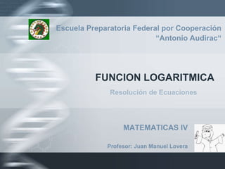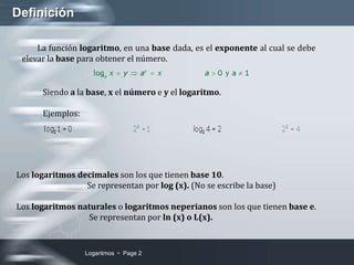 Este documento explica la función logarítmica. Define los logaritmos decimales y naturales, y sus propiedades clave como que no existen logaritmos de números negativos o cero. Explica cómo usar las propiedades de los logaritmos, como que el logaritmo de un producto es la suma de los logaritmos de los factores, para resolver ecuaciones logarítmicas. Incluye ejemplos numéricos de cálculos con logaritmos y resolución de ecuaciones logarítmicas.
