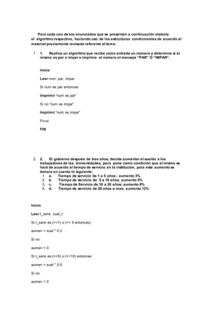 Este documento presenta dos ejercicios de estructuras condicionales para un estudiante de ingeniería eléctrica. El primer ejercicio pide crear un algoritmo que determine si un número es par o impar. El segundo ejercicio pide crear un algoritmo que calcule el aumento de sueldo de acuerdo al tiempo de servicio de un trabajador universitario, aplicando diferentes porcentajes de aumento según el rango de años trabajados.