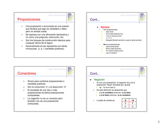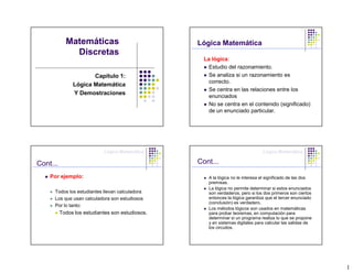 El documento presenta conceptos básicos de lógica matemática. Explica que la lógica se enfoca en analizar la validez de los razonamientos sin considerar el contenido de los enunciados. Introduce las proposiciones, conectores lógicos como la conjunción y la disyunción, y tablas de verdad para determinar el valor de verdad de proposiciones compuestas.