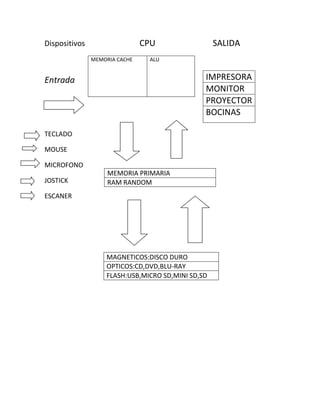 La CPU contiene la unidad de procesamiento central y la memoria caché. Recibe entrada de dispositivos como el teclado, mouse y micrófono y almacena datos en la memoria primaria y dispositivos de almacenamiento como el disco duro, CDs y USBs. Procesa la información y envía salida a dispositivos como el monitor, impresora y bocinas.