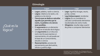 El documento aborda la lógica desde sus fundamentos, definiendo conceptos clave como argumento, razonamiento y tipos de lógica, incluyendo lógica formal, informal, inductiva y deductiva. También destaca la diferencia entre conceptos y nociones, así como la lógica jurídica, que se centra en situaciones concretas y variables a diferencia de las ciencias formales. Además, se menciona el trabajo de Karl Popper sobre las ciencias sociales y la relación entre conocimiento e ignorancia.