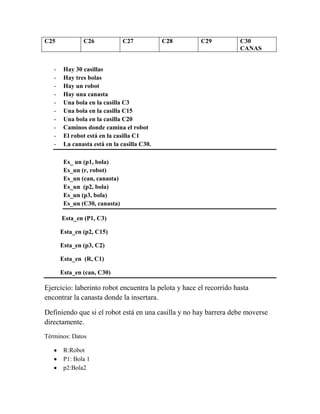 Este documento presenta un problema de ingeniería del conocimiento sobre un robot en un laberinto. Describe un laberinto de 30 casillas con 3 bolas y una canasta. Define términos como robot, bolas, casillas y canasta. Establece reglas lógicas para que el robot encuentre las bolas en las casillas correspondientes, las recoja y las inserte en la canasta en la casilla 30 al moverse entre casillas adyacentes sin barreras.