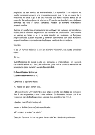 El documento habla sobre lógica de predicados y funciones proposicionales. Define funciones proposicionales como enunciados abiertos que contienen variables, y se convierten en proposiciones cuando se sustituyen las variables. Explica cuantificadores universales y existenciales, y cómo simbolizar proposiciones con ellos. También cubre negación de cuantificadores y proposiciones con dos cuantificadores.
