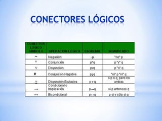 Este documento describe conceptos básicos de lógica, incluyendo las definiciones de proposiciones simples y compuestas, y las reglas de la negación, conjunción, disyunción, conjunción negativa, disyunción exclusiva, condicional y bicondicional. Explica que la lógica estudia la forma del razonamiento y determina si un argumento es válido mediante el uso de reglas y técnicas.