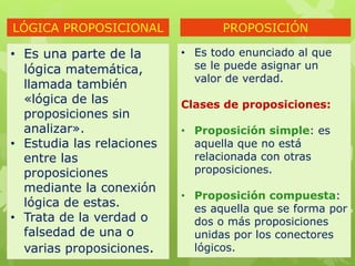 Este documento resume la lógica proposicional, incluyendo proposiciones, conectores lógicos como conjunción, disyunción, condicional y bicondicional, tablas de verdad y circuitos lógicos. Explica que la lógica proposicional estudia las relaciones entre proposiciones mediante conectores lógicos y trata de determinar la verdad o falsedad de proposiciones.