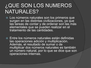 El documento habla sobre los números naturales y sus operaciones básicas. Explica que los números naturales son los primeros números que surgieron y se usan para contar. Describe que la suma y multiplicación son operaciones internas en los naturales, mientras que la resta y división no lo son y requieren la creación de otros conjuntos numéricos como los enteros y racionales. Luego define cada una de las cuatro operaciones básicas de la aritmética.