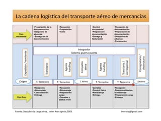 El documento describe los diferentes tipos de transporte aéreo de mercancías, incluyendo el transporte aéreo urgente, económico y con fecha definida. También explica los servicios de transporte aéreo de DHL como DHL Air First, DHL Air Value, DHL Premium, DHL Airfreight Plus y el transporte en aeronave chárter.