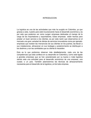 Este documento describe la logística en Colombia. Explica que la logística es importante para el desarrollo económico del país y cómo ha surgido una variedad de empresas dedicadas a servicios logísticos innovadores. También describe los objetivos de la logística, las normas de seguridad e higiene importantes, y los diferentes modos de transporte como terrestre, marítimo y aéreo en Colombia. Finalmente, identifica algunos desafíos como la infraestructura vial y la necesidad de mejorar la gestión empresarial en el sector log