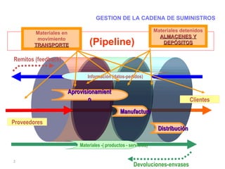 El documento describe los cuatro procesos principales de la gestión de la cadena de suministros (SCOR): 1) la obtención y recepción de materiales, 2) la producción, 3) la gestión de pedidos y 4) la entrega. Explica que estas actividades logísticas incluyen la administración de proveedores, inventarios, almacenes, transporte y clientes para asegurar el flujo eficiente de materiales a lo largo de la cadena de suministro.