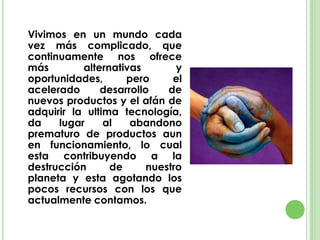 El documento discute los desafíos ambientales causados por el rápido desarrollo tecnológico y el consumismo, incluido el abandono prematuro de productos aún funcionales. También explica que la sobreproducción y el consumo excesivo están agotando los recursos del planeta y deteriorando los ecosistemas. Propone que la gestión ambiental de los productos y residuos a lo largo de todo su ciclo de vida, incluida la reparación, renovación, reutilización y reciclaje, puede ayudar a las empresas y prote