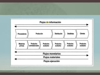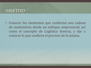 El documento describe los elementos clave de una cadena de suministro, incluyendo proveedores, fabricantes, distribuidores y clientes. Explica los flujos materiales, informativos y financieros en la gestión de las cadenas de suministro. Además, define la logística inversa como el proceso de planificar y controlar el flujo de materiales desde el punto de consumo al origen para recuperar valor. Finalmente, detalla los procesos clave de la logística inversa como la reutilización, reparación, reciclaje y su enfo