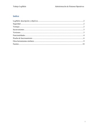 El documento describe LogMeIn, una aplicación que permite el acceso remoto a un ordenador desde cualquier lugar a través de Internet. Explica que LogMeIn usa cifrado SSL para proteger la seguridad y requiere dos contraseñas distintas. También resume las ventajas, versiones, funcionalidades y provee un ejemplo de cómo usar LogMeIn para acceder de forma remota a un ordenador.