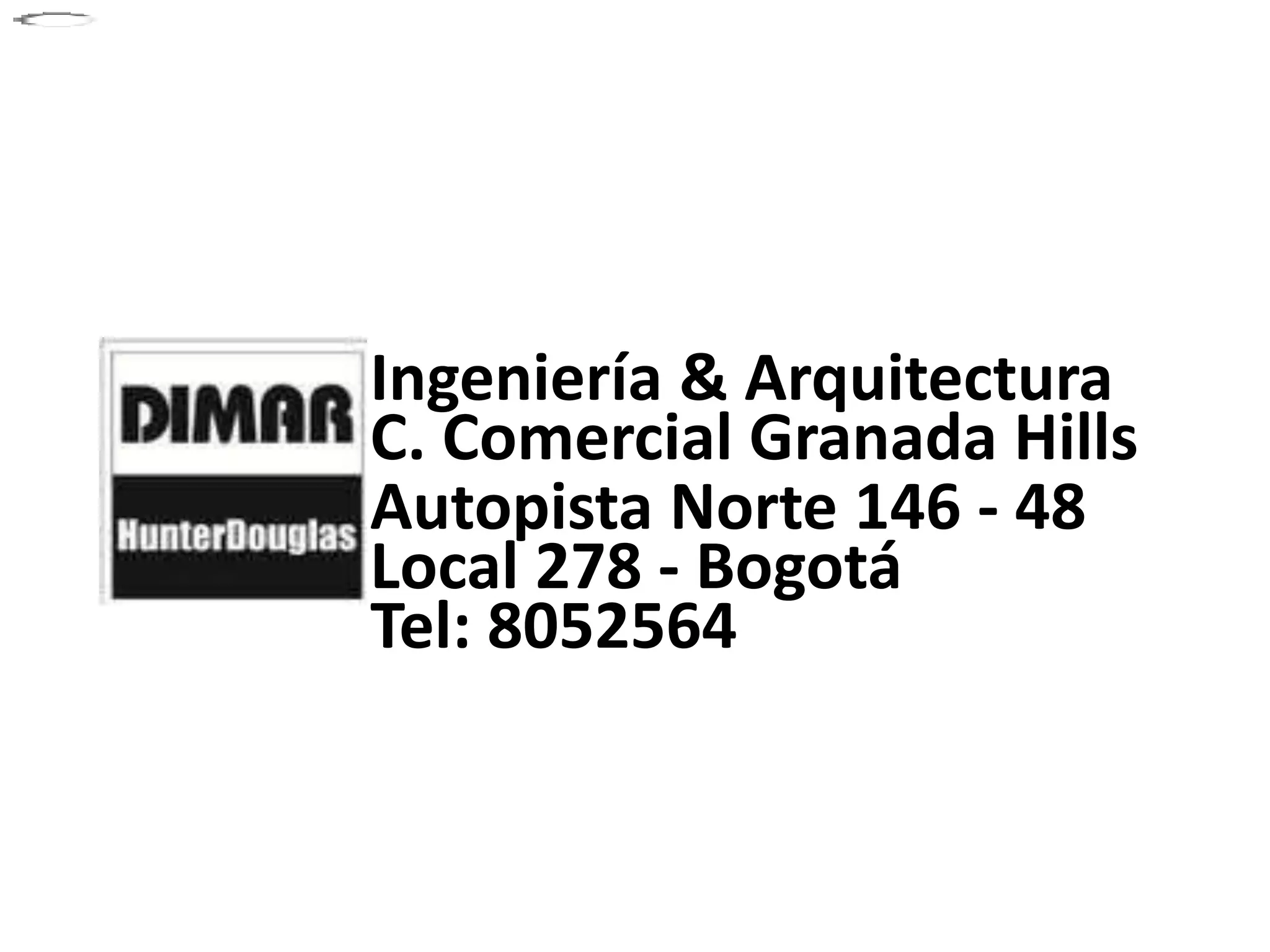 La empresa Ingeniería & Arquitectura se dedica a la ingeniería y arquitectura, está ubicada en el Centro Comercial Granada Hills en la Autopista Norte 146-48 Local 278 en Bogotá y su número de teléfono es 8052564.