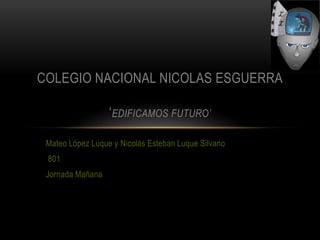 El documento presenta el colegio Nacional Nicolás Esguerra en Bogotá, Colombia. El colegio tiene como lema "Edificamos Futuro" y los estudiantes Mateo López Luque y Nicolás Esteban Luque Silvano cursan el grado 801 en la jornada de la mañana.