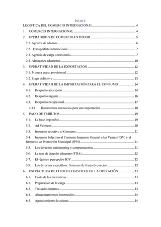 Este documento presenta información sobre la logística del comercio internacional. Explica conceptos clave como el comercio internacional, los operadores de comercio exterior como agentes de aduanas y transportistas internacionales, y los procesos de exportación e importación. También describe los pagos de tributos y la estructura de costos logísticos que incluyen gastos de mercancías, transporte, almacenamiento y agenciamiento aduanero.