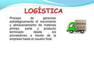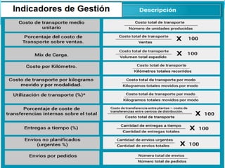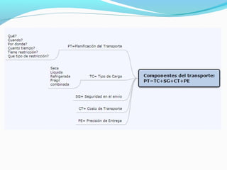 El documento trata sobre logística y transporte. Define la logística como el proceso de gestionar el movimiento y almacenamiento de materias primas, partes y productos terminados desde los proveedores hasta el usuario final. Explica que el transporte es el elemento vital en el diseño y administración de un sistema integrado de gestión logística. Describe los diferentes modos de transporte como terrestre, marítimo, aéreo y fluvial y los factores que influyen en la decisión de qué transporte utilizar.