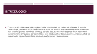 Este documento describe la importancia de la educación inicial para los niños. Explica que los primeros años de vida son fundamentales para el desarrollo de habilidades, por lo que la etapa infantil debe estimularse en todos los sentidos. La educación inicial, dirigida a niños de 0 a 6 años, complementa la labor de las familias al fomentar el desarrollo físico, psicológico y de la creatividad de los niños. La educación inicial es un derecho que garantiza un desarrollo armónico y prepara a los niños para la vida