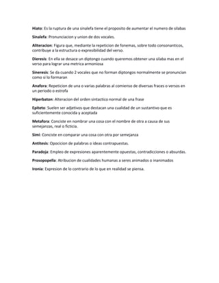 Este documento define varios términos literarios como hiato, sinalefa, aliteración, dieresis, sinéresis, anáfora, hipérbaton, epíteto, metáfora, símil, antítesis, paradoja, prosopopeya e ironía. Estos términos se refieren a figuras retóricas y recursos estilísticos que afectan la métrica, pronunciación, orden de palabras y comparaciones en la poesía y prosa.