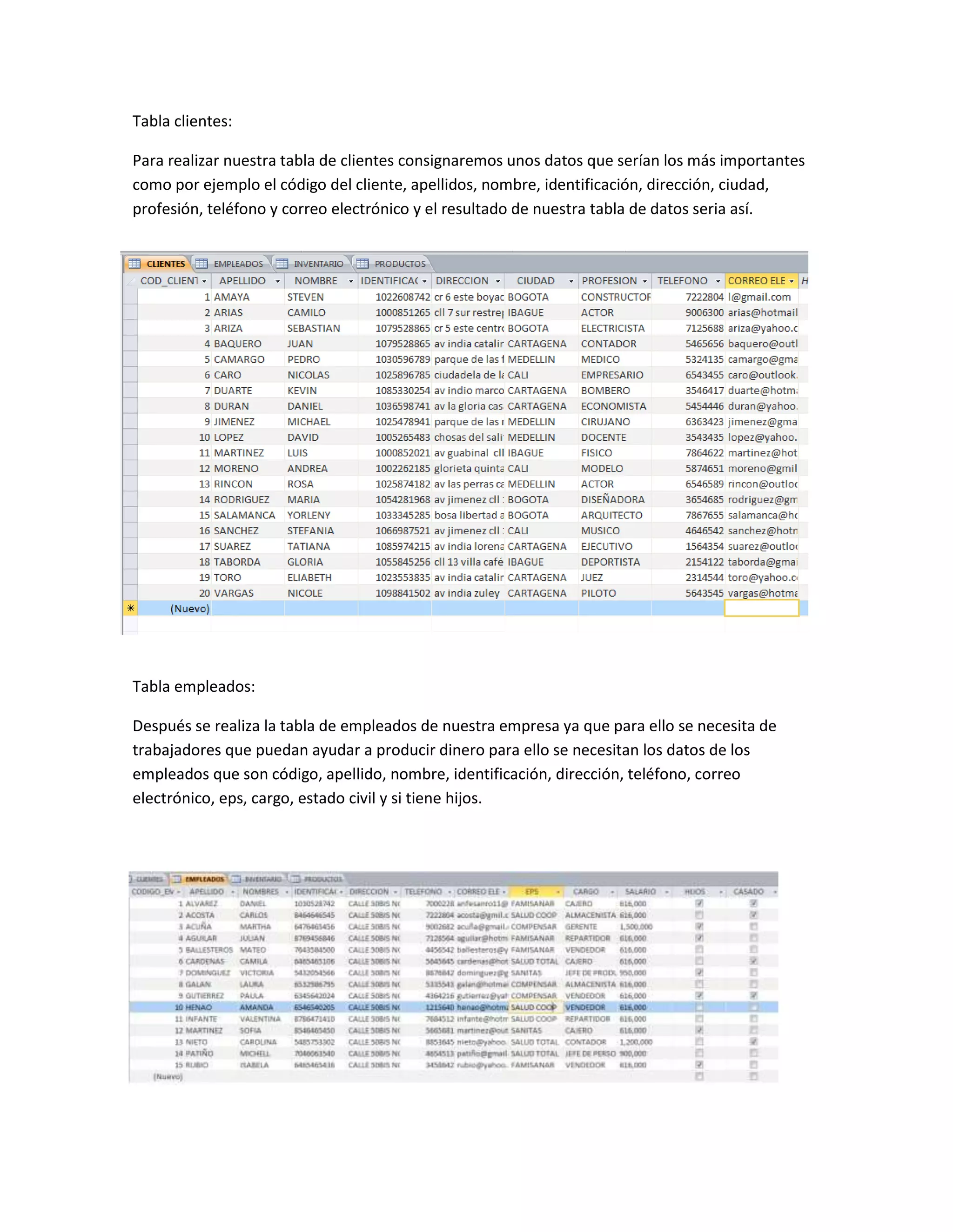 La primera oración describe una tabla de clientes con datos como código, nombre, dirección y contacto. La segunda oración describe una tabla de empleados con datos similares como código, nombre e información laboral y personal. Ambas tablas son necesarias para gestionar los datos de clientes y empleados de una empresa.