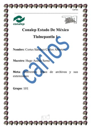 El documento describe los objetivos de Carlos Cortes Sánchez, un estudiante del Conalep Estado de México en Tlalnepantla. Su meta es aprender sobre los diferentes tipos de archivos y sus extensiones para un proyecto escolar con su maestro Hugo Acosta Serna en el grupo 101.