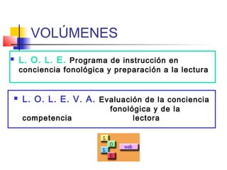 Este documento presenta el programa L.O.L.E., el cual consta de 32 unidades didácticas con juegos para desarrollar la conciencia fonológica en niños de 3 a 5 años. El programa cubre tres niveles: rima, sílaba y fonema. Cada unidad incluye objetivos, actividades guiadas y hojas de registro para evaluar el progreso de los estudiantes. El programa puede ser aplicado por maestros y especialistas para facilitar el aprendizaje de la lectura.