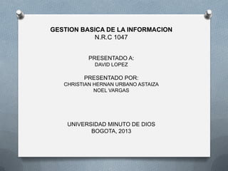 Este documento presenta información sobre la misión, visión y reglamentos de la Universidad Minuto de Dios en Bogotá, Colombia. Su misión es mantener la espiritualidad Eudista y formar profesionales éticos con competencias académicas. Su visión es ofrecer programas de alta calidad con impacto nacional e internacional. El reglamento estudiantil describe los derechos, deberes y normas de calificación de los estudiantes, así como los requisitos para subsidios y becas. También explica los porcentajes de inas