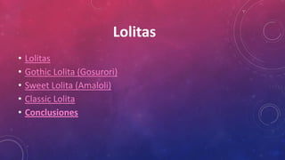 Este documento describe diferentes estilos de Lolita, una subcultura japonesa que combina la moda de las épocas pasadas con una actitud de libertad juvenil. Explica el Gothic Lolita, basado en el estilo gótico y barroco, el Sweet Lolita más infantil y tierno, y el Classic Lolita más maduro con menos adornos. También menciona que los orígenes de esta subcultura se remontan a los años 70 y 80 en Japón luego de un movimiento feminista.