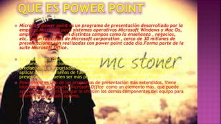 El documento habla sobre Microsoft PowerPoint, un programa de presentaciones desarrollado por Microsoft que se usa ampliamente en la enseñanza y los negocios. Más de 30 millones de presentaciones se realizan diariamente con PowerPoint. Es parte de Microsoft Office y permite crear presentaciones con texto, imágenes y animaciones. PowerPoint es uno de los programas de presentación más populares disponibles.