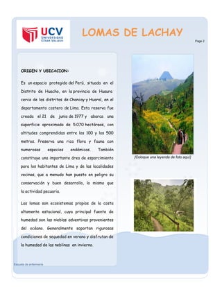El documento describe la Reserva Nacional Lomas de Lachay, un área natural protegida ubicada en la provincia de Huaura, Lima. La reserva de 5,070 hectáreas fue creada en 1977 y alberga una rica flora y fauna endémica. Tiene un clima estacional con una época húmeda de junio a octubre y una época seca de enero a mayo. Sin embargo, el turismo desordenado y otras actividades humanas amenazan este ecosistema frágil.