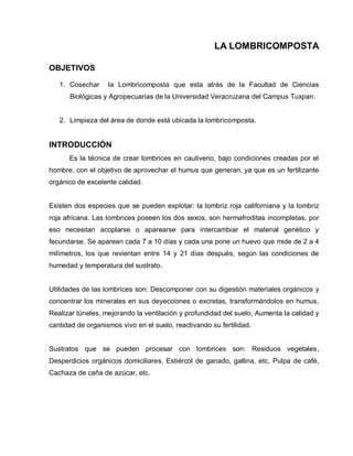 Este documento describe una práctica de cosecha de lombricomposta realizada por estudiantes de Ingeniería Agronómica. El objetivo fue cosechar la lombricomposta detrás de la Facultad de Ciencias Biológicas y limpiar el área. Se utilizaron palas, carretillas y otros equipos para recolectar aproximadamente 1 kg de humus de lombriz por equipo, el cual se distribuyó en una mini parcela para mejorar el suelo. Los estudiantes concluyeron que la lombricomposta es