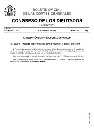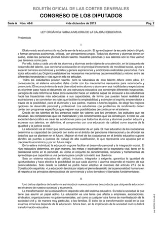 Este documento presenta un proyecto de ley orgánica para mejorar la calidad educativa en España. El proyecto de ley tiene como objetivo introducir nuevos patrones de conducta que sitúen la educación en el centro de la sociedad y economía españolas. También busca elevar los niveles educativos actuales para fomentar la convivencia pacífica y el desarrollo cultural. El proyecto de ley pretende mejorar la calidad del sistema educativo español para garantizar la igualdad de oportunidades y permitir que cada estudian