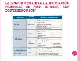 El documento describe los cambios en el currículo escolar español, incluyendo la reestructuración de las materias, la introducción de dos itinerarios educativos en 4o de la ESO, y la implementación de evaluaciones periódicas. También especifica los objetivos, competencias, contenidos y criterios de evaluación para cada materia y etapa educativa, así como un enfoque en el desarrollo de competencias lingüísticas y STEM.