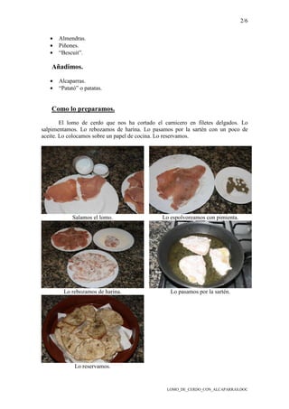 Este documento proporciona una receta para lomo de cerdo con alcaparras. Incluye instrucciones para preparar el lomo y la panceta en la sartén, hacer un sofrito con cebolla, ajo, tomate y vino, y luego colocar los ingredientes en una cazuela junto con el majado de almendras, piñones y bescuit. La cazuela se cuece lentamente y se sirve con patatas fritas y alcaparras.