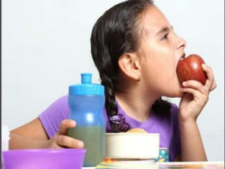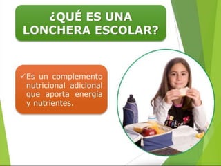 El documento describe por qué es importante que los escolares lleven una lonchera a la escuela, incluyendo que complementa su alimentación, repone su energía, evita una disminución en su rendimiento escolar y recupera la hidratación perdida. Además, explica que una lonchera debe ser nutritiva, sencilla, variada y con la cantidad adecuada de alimentos. Finalmente, detalla los ingredientes ideales de una lonchera como lácteos, huevos, carnes, frutas, verduras y cereales.
