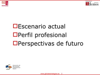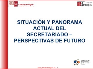 El documento describe la situación actual y las perspectivas de futuro de la profesión de secretariado. Actualmente, la profesión sufre carencias como falta de reconocimiento oficial, bajos salarios, y presentismo. Históricamente, el rol del secretariado ha evolucionado de secretaria a asistente con habilidades técnicas y blandas. En el futuro, los retos incluyen obtener reconocimiento oficial, titulación, y visibilidad en convenios colectivos. A pesar de los desafíos, el secretariado tendrá nuevas oport