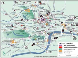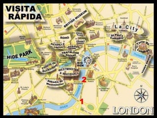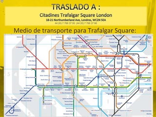 Este documento proporciona información sobre opciones de transporte y atracciones turísticas en Londres. Detalla cómo llegar al aeropuerto de Heathrow y conectarse al centro de Londres usando el Heathrow Express. También menciona atracciones populares como Trafalgar Square, el Big Ben, Buckingham Palace y la Catedral de San Pablo, incluyendo detalles sobre ubicación, horarios y transporte. El documento ofrece enlaces a mapas y guías adicionales sobre cómo moverse y qué visitar en Londres.