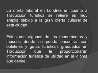 Este documento proporciona información sobre varios monumentos y museos populares en Londres, incluida la Abadía de Westminster, el Palacio de Buckingham, la Catedral de St. Paul, Harrods, Tate Modern, el Museo Británico, el Museo de Historia Natural y la Galería Nacional, donde los visitantes pueden encontrar guías de turismo graduados en traducción que ofrecen información útil en diferentes idiomas.