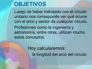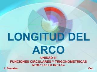 Este documento explica cómo calcular la longitud de un arco de círculo. Indica que depende de si el ángulo del arco está en grados u radianes, y presenta las fórmulas para calcular la longitud del arco en cada caso. También incluye ejemplos resueltos de cómo aplicar estas fórmulas.